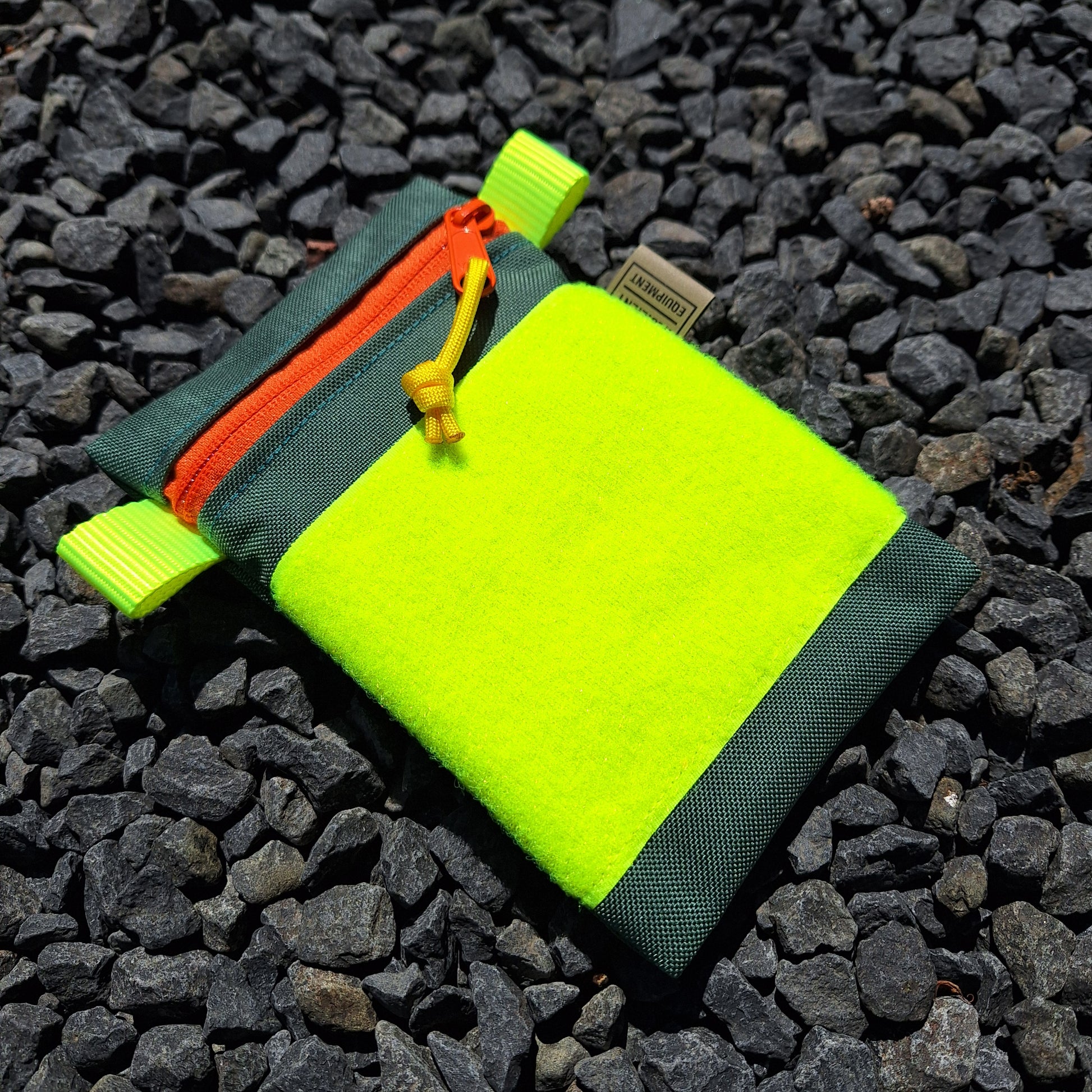 Here we have our vertical pouch in bronze green 1000d nylon with a YKK orange zip. This pouch is lined with orange 4oz nylon. It has flouro yellow webbing tabs and a 100mm high loop velcro panel. These pouches measure approximately 12cm x 19cm.