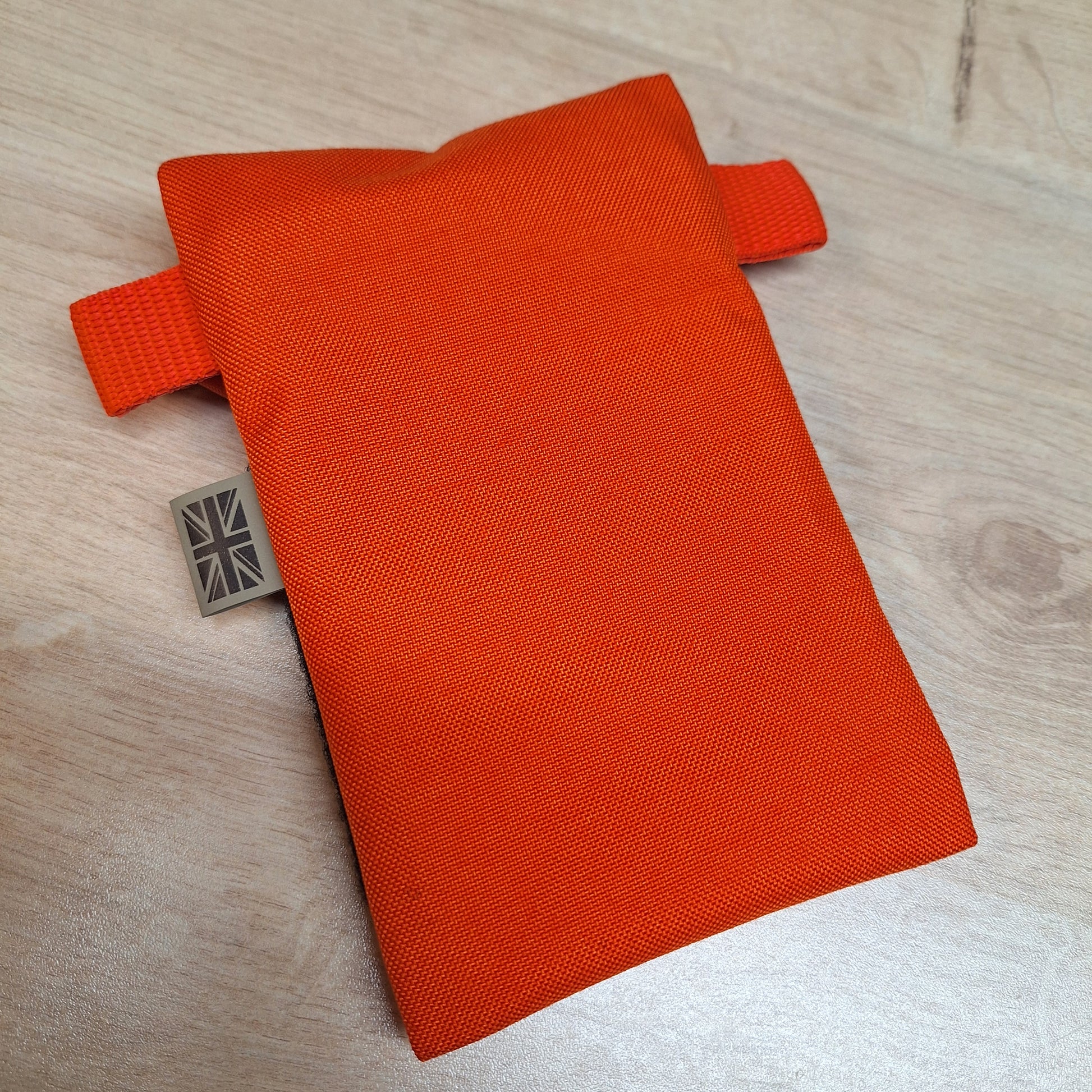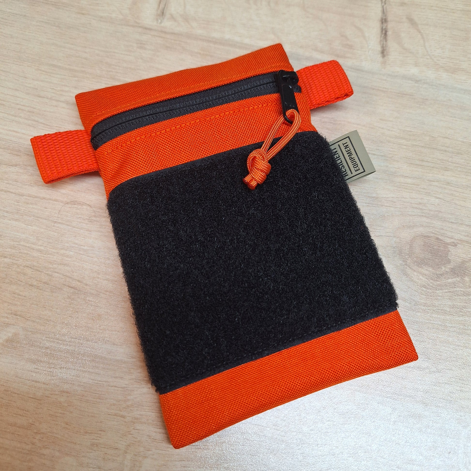 Here we have our vertical pouch in orange 1000d nylon with a black YKK zip. These pouches have orange webbing tabs and a black 100mm high loop panel. They are lined with 4oz orange nylon and measure approximately 12cm x 19cm.