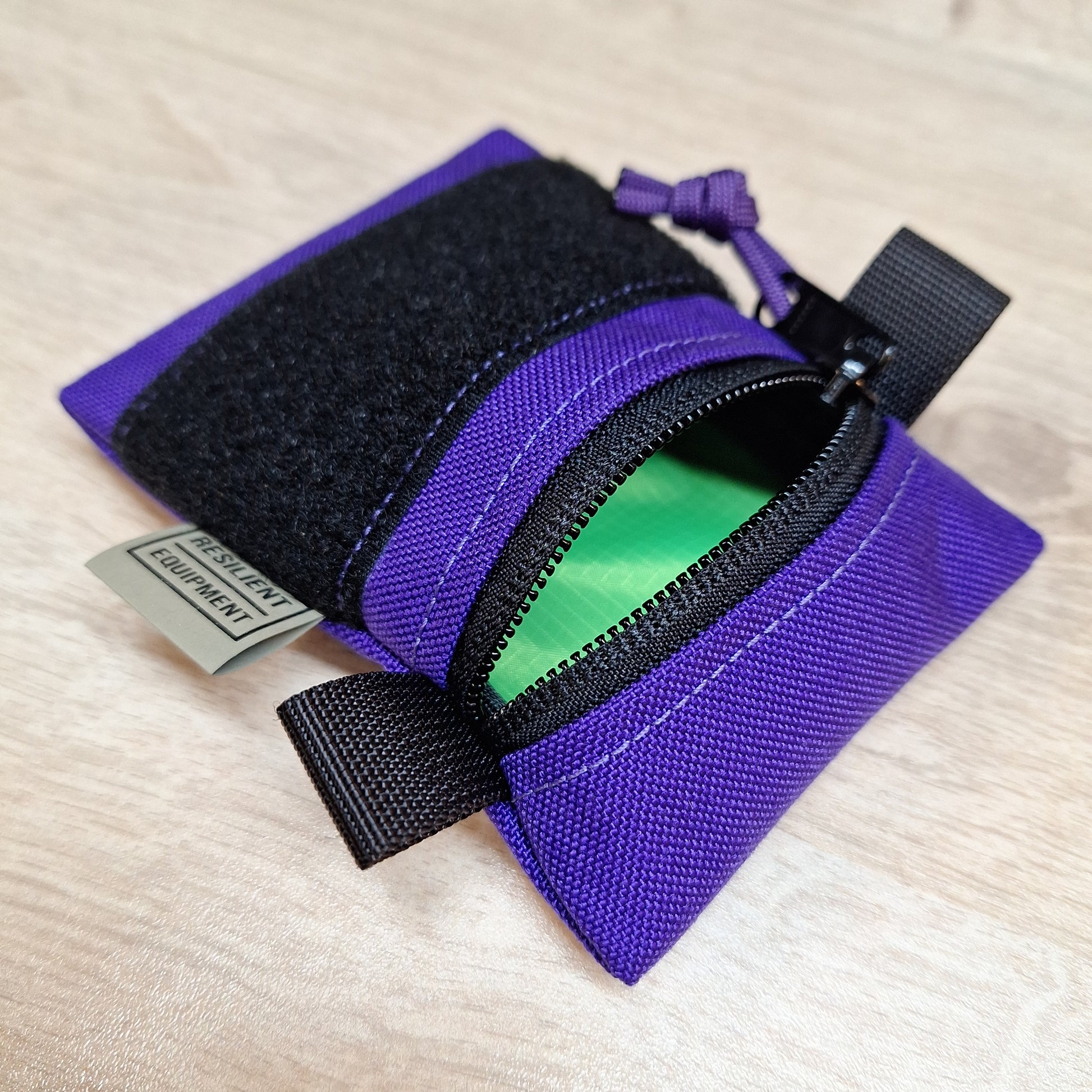 Here we have our mini pouch in purple 1000d nylon with a black YKK zip. These pouches have a 50mm high black loop velcro panel and are lined with flouro green ripstop. These pouches measure approximately 9cm x 12cm.