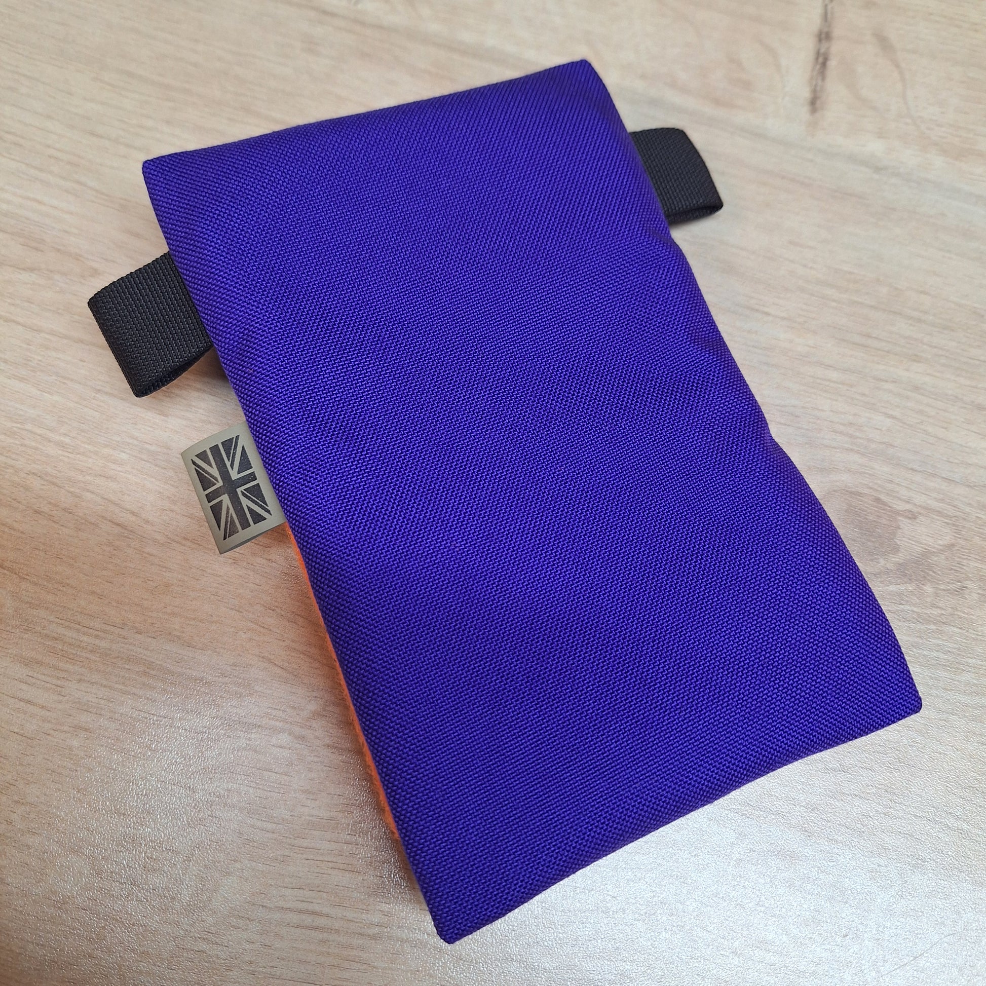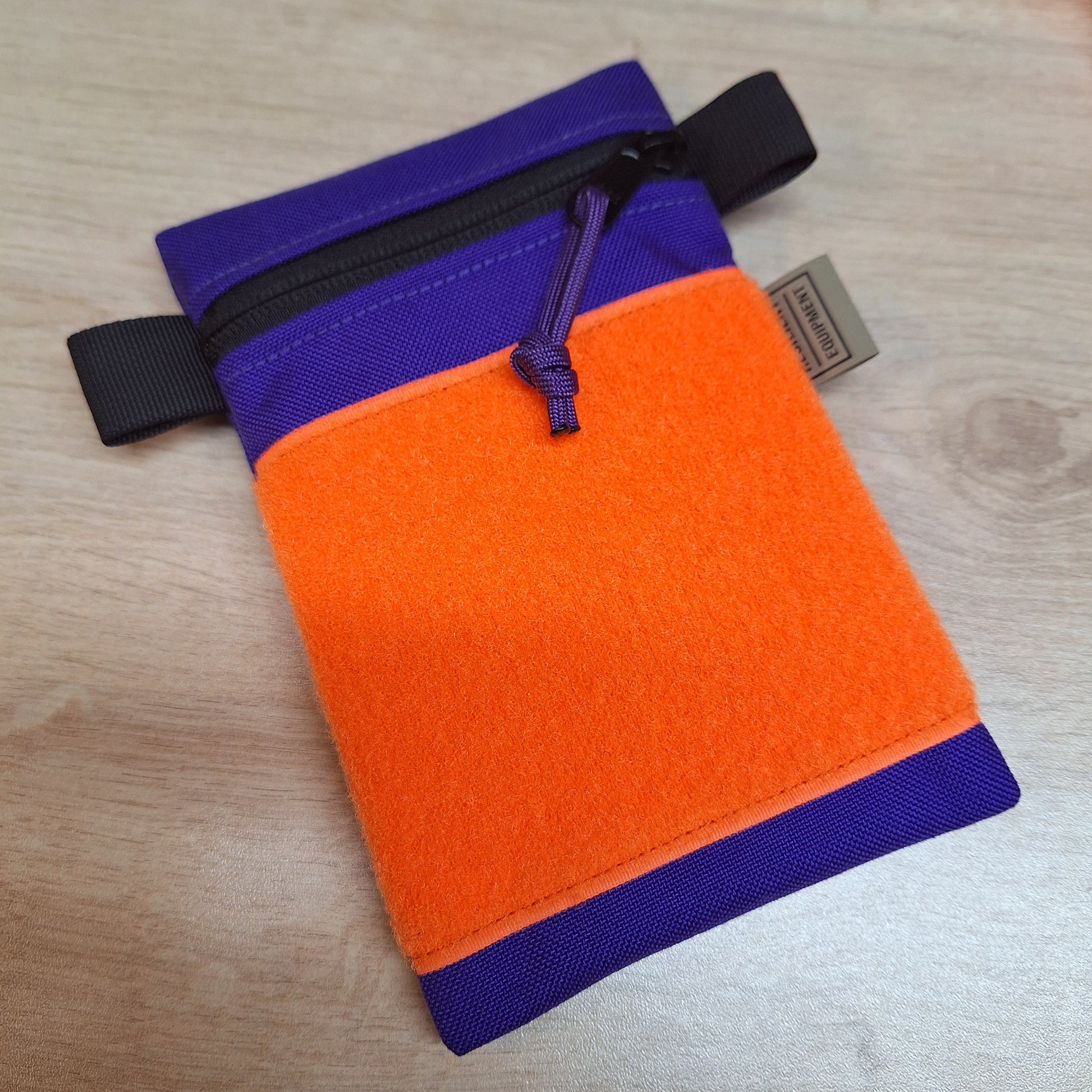 Here we have our vertical pouch in purple 1000d nylon with a black YKK zip. These pouches have black webbing tabs and a 100mm high flouro orange loop panel. They are lined with orange 4oz nylon and measure approximately 12cm and 19cm.